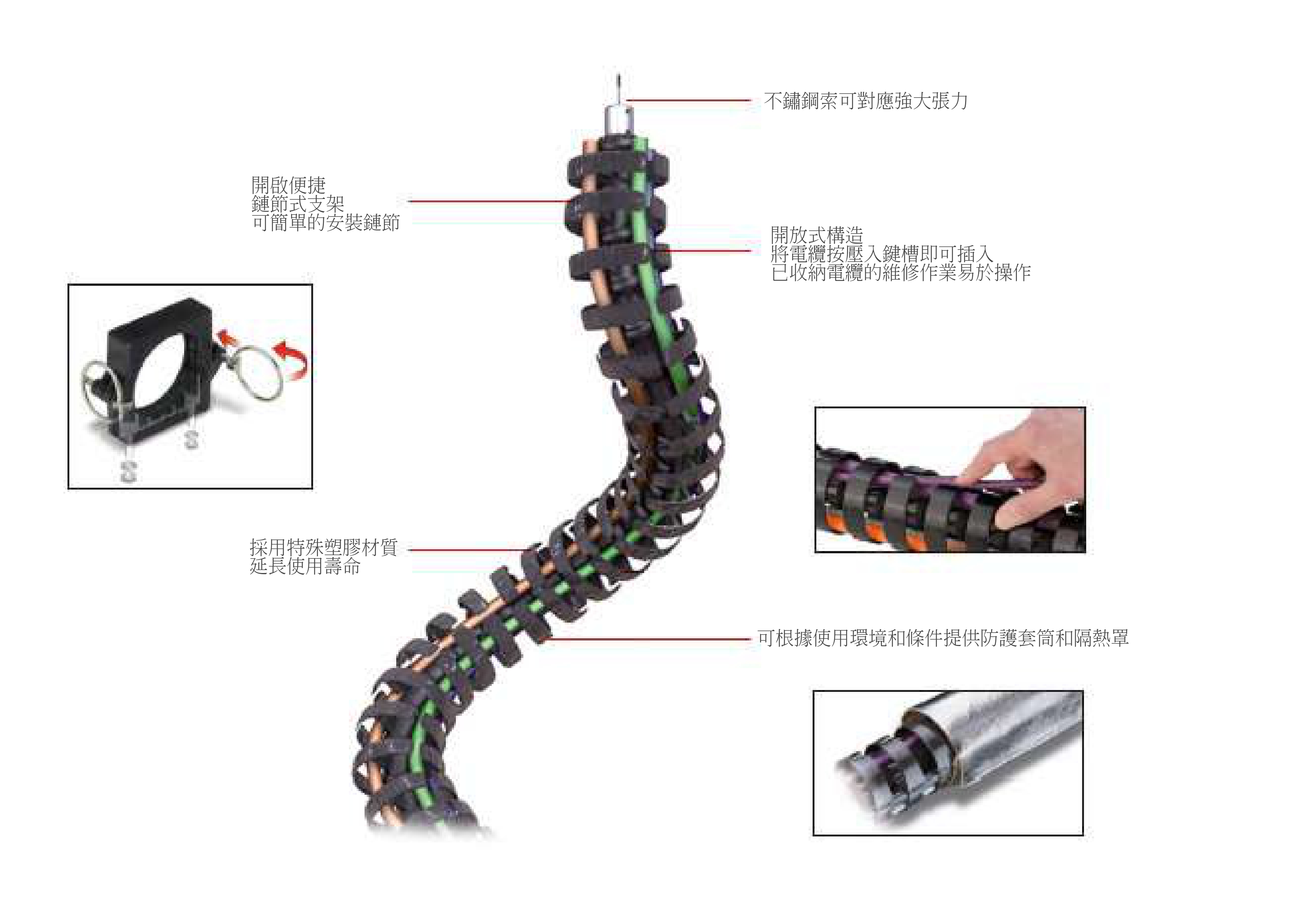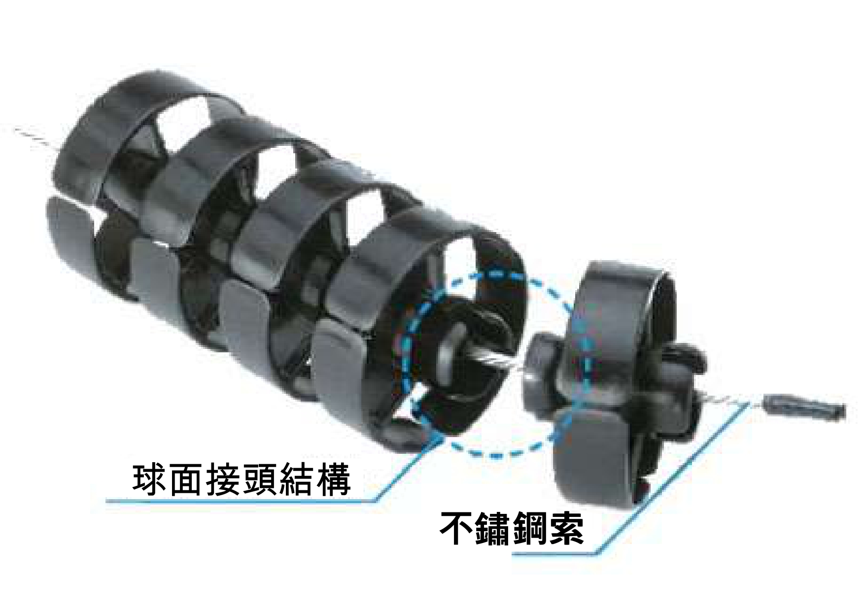 工程塑膠製成的鏈節(jié)兩端以球面接頭結(jié)構(gòu)連接,鏈節(jié)中心內(nèi)建不鏽鋼索,確保強(qiáng)度與靈活性。